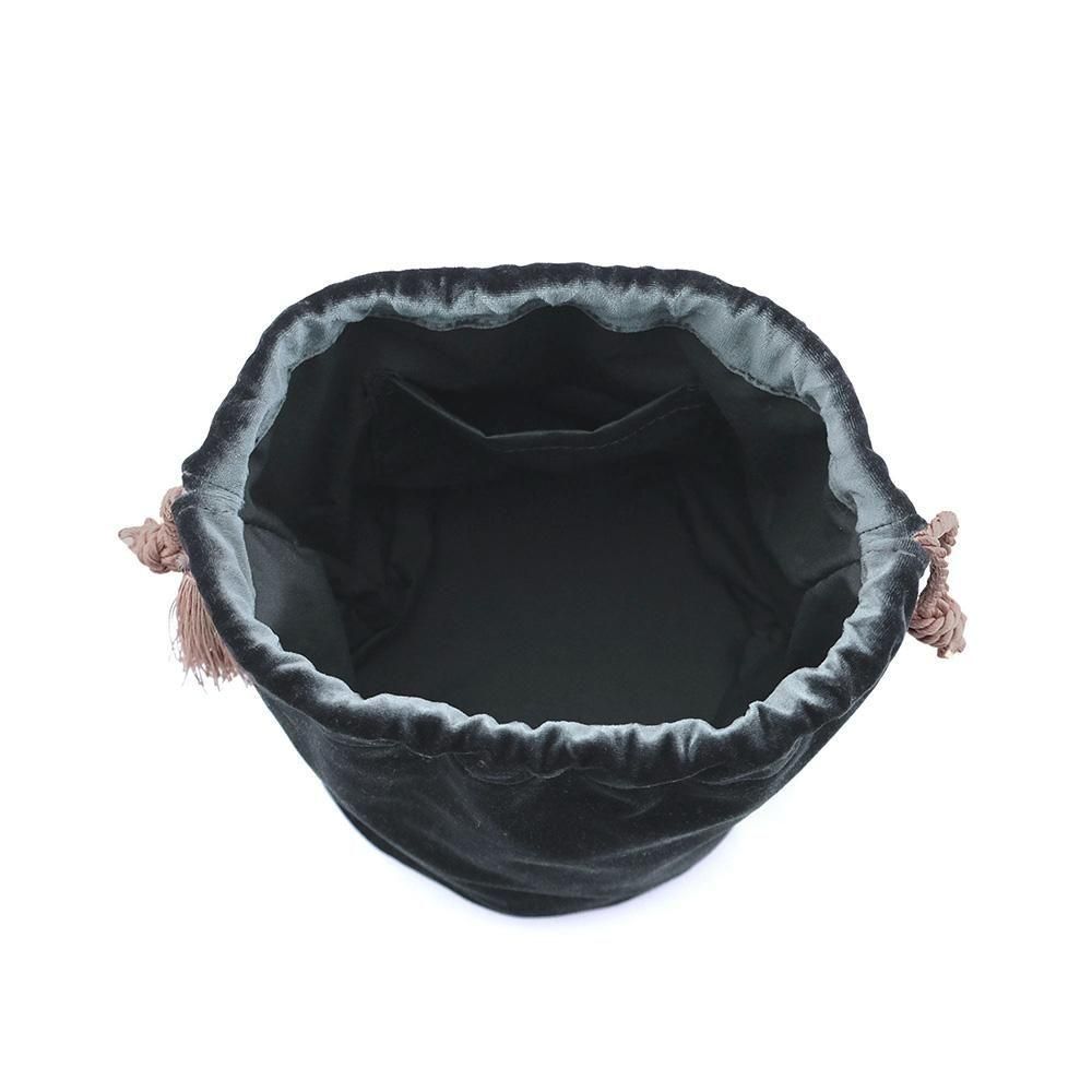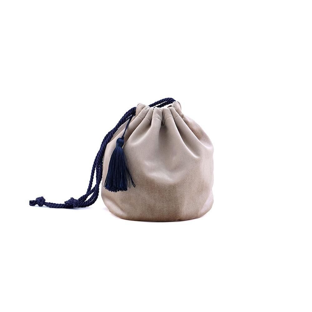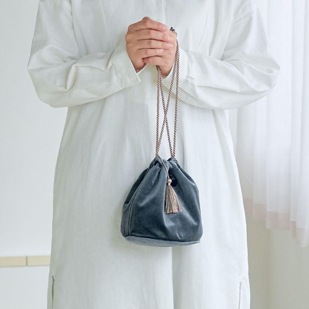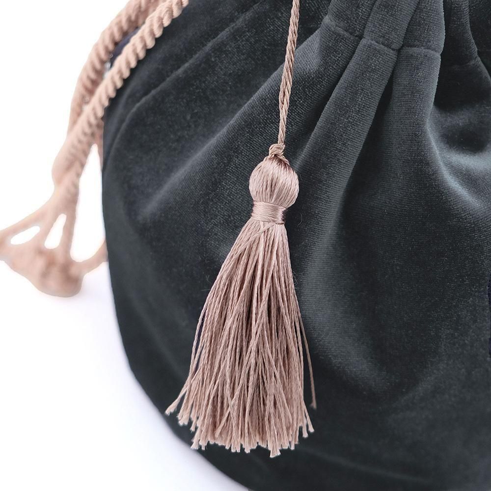 艶のあるツイストロープを使用したポーチバッグです。ベロアの光沢とロープ、タッセルが雰囲気を出し、まるでアンティークのような佇まい。小さめサイズですが、丸底なので財布やリップ、ハンドクリームにハンカチ、ちいさなお菓子。必要な荷物はばっちり入ります。
