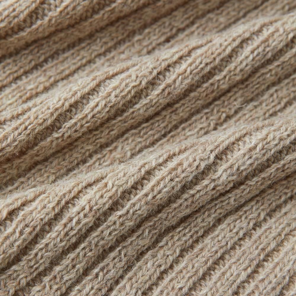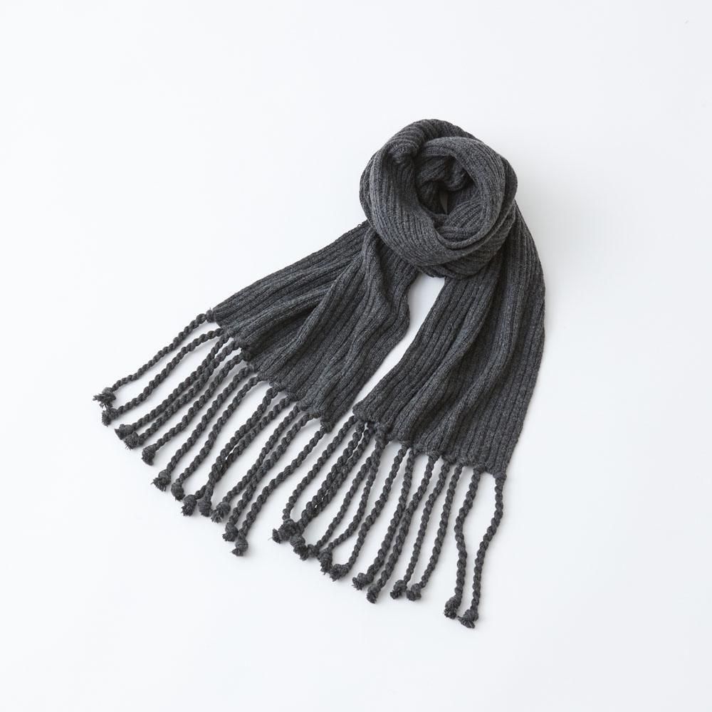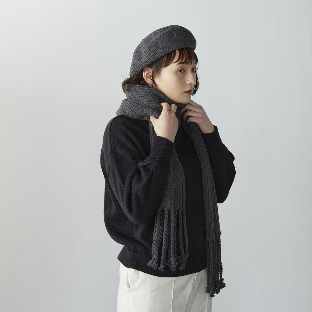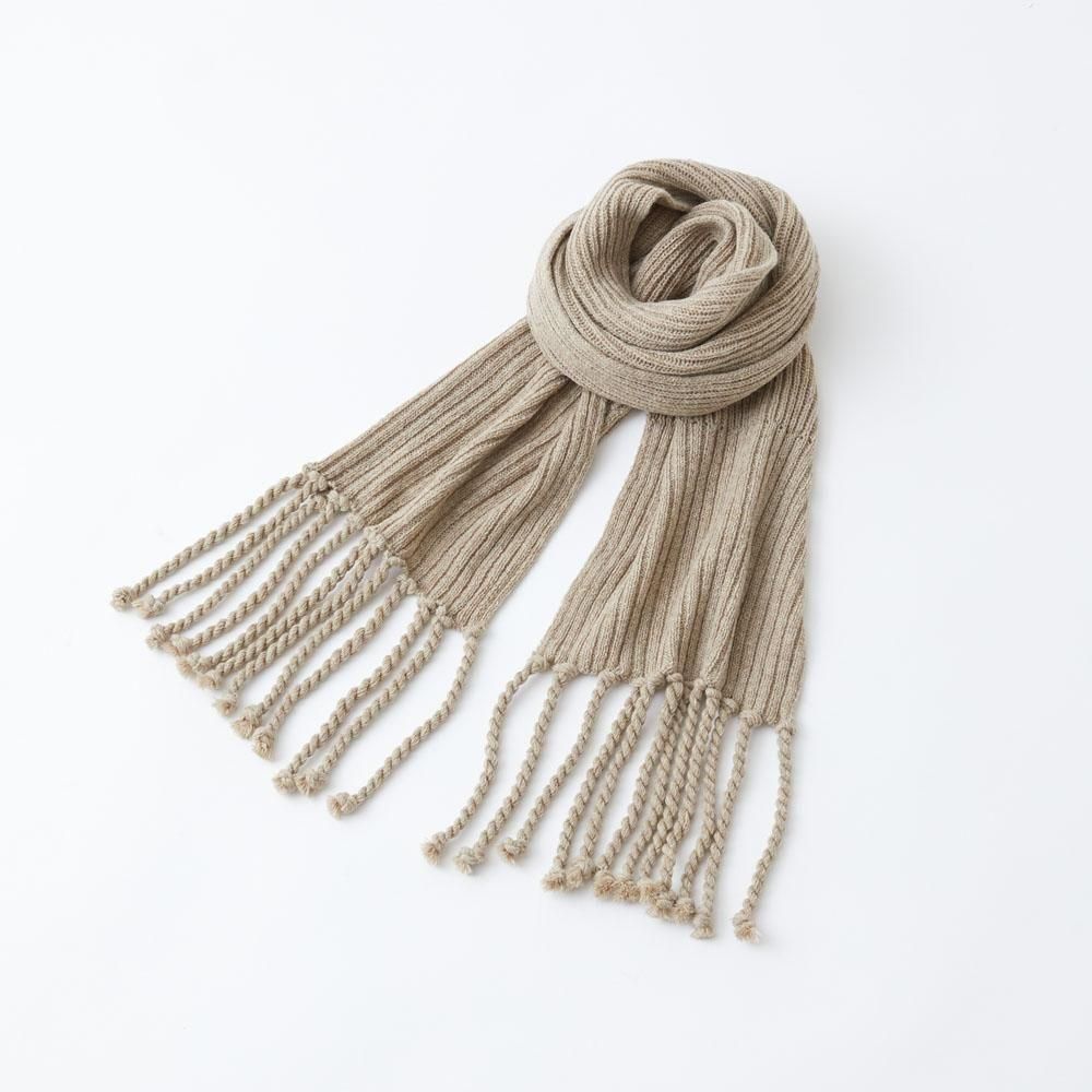 寒い時期に大活躍のリブ編みマフラーは、巻いた時に美しい微妙なニュアンスを表現するため、2目ゴム編みとイギリスゴム編み、2種類のリブ編みを採用しています。しっかりボリュームがあり、太めの長いフリンジが特徴です。柔らかいニット生地で首あたりも◎巻くだけでおしゃれに決まります。